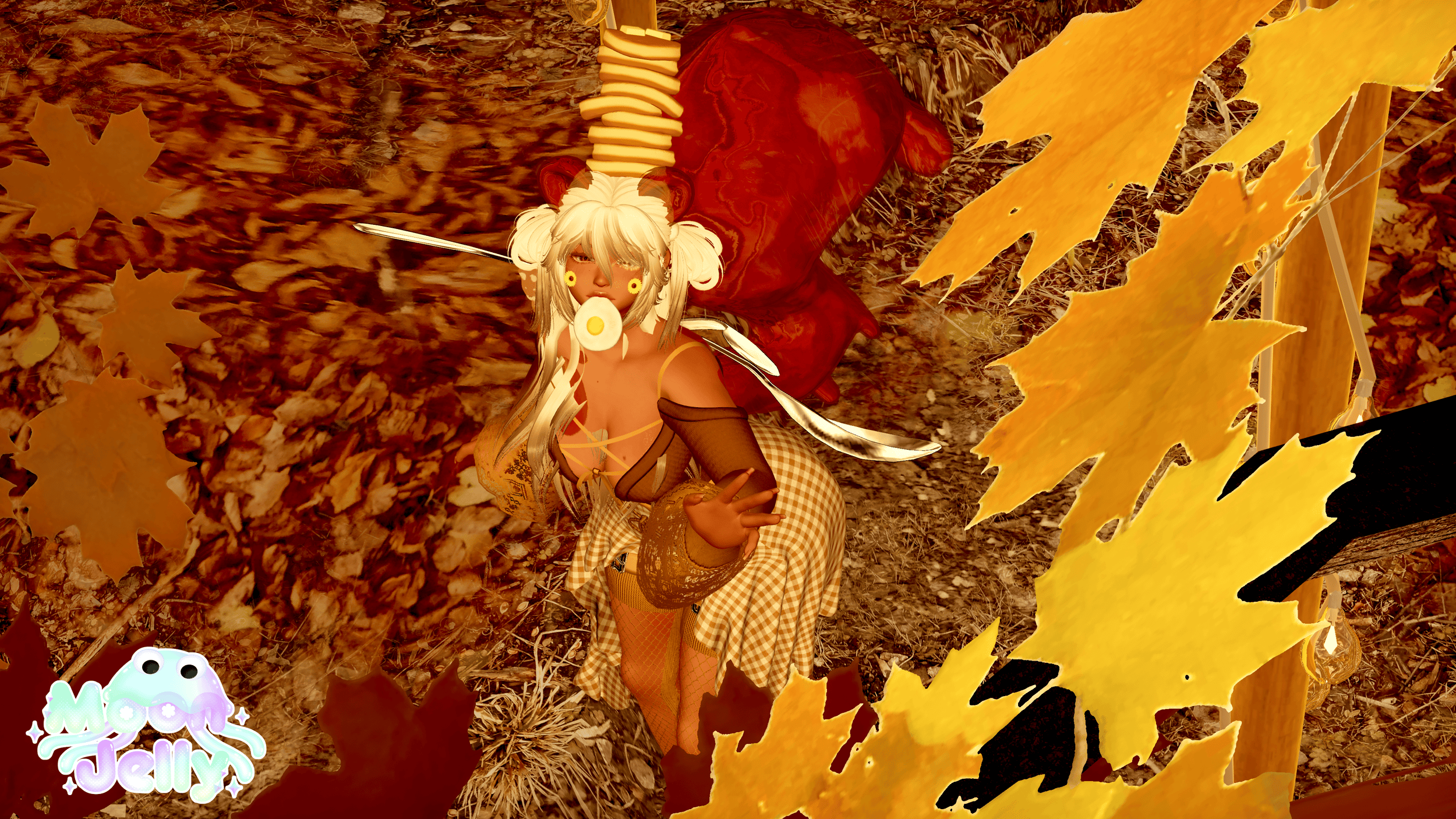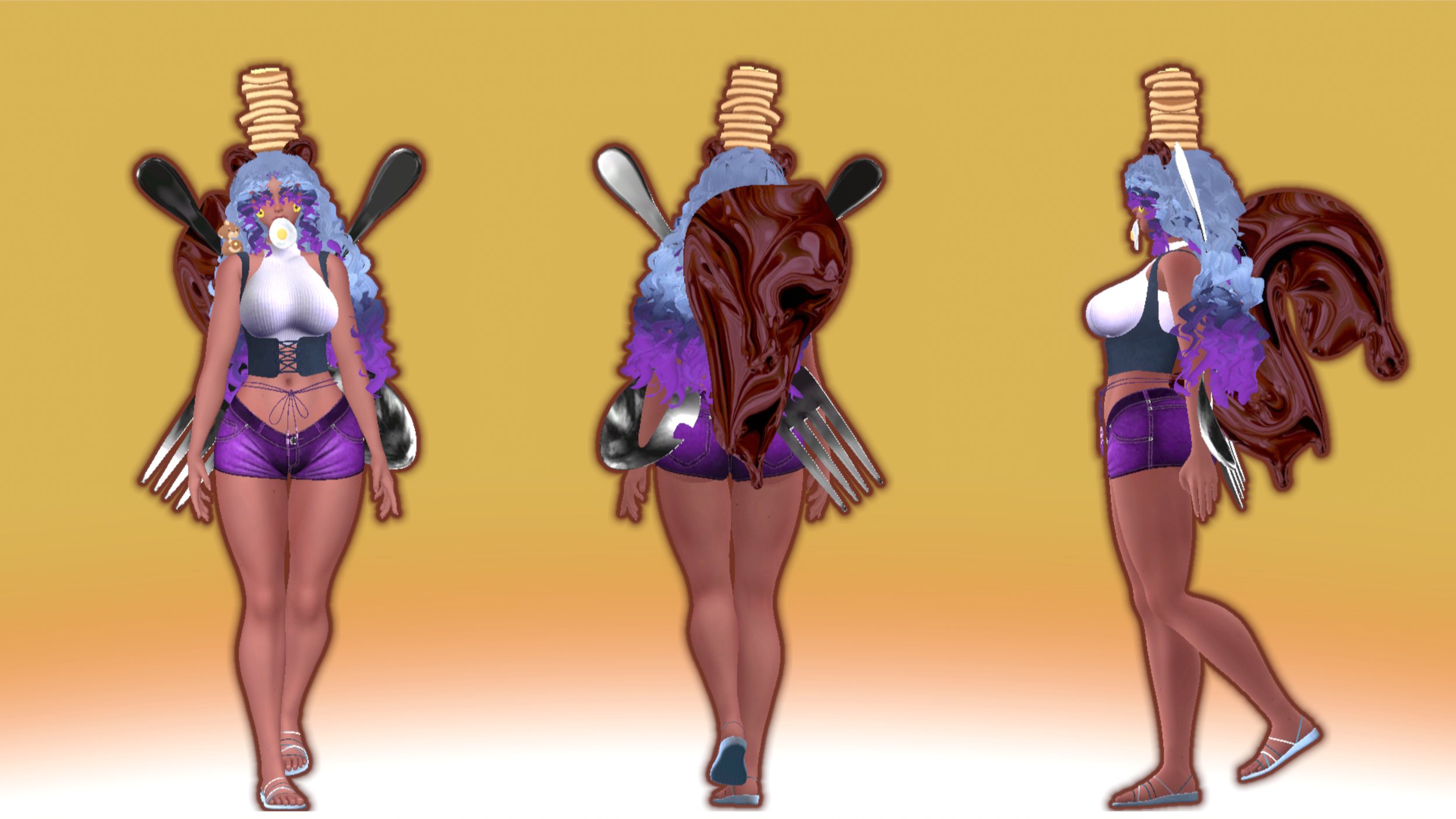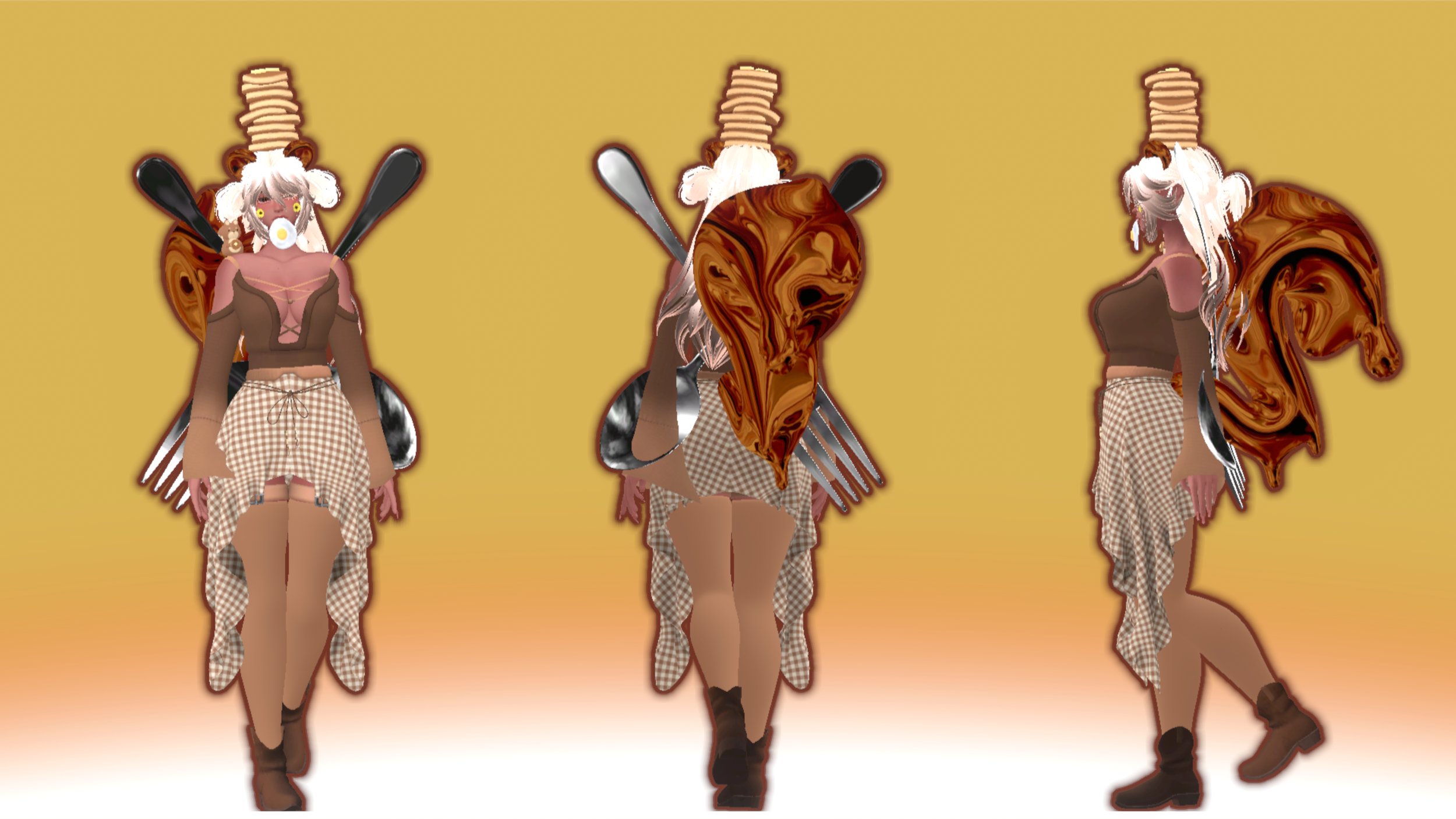 ♡ㅤPancake Flipping Game, Syrup Flow Toys, Giant Fork, Giant Spoon, Skirt, "Bottoms," Garters, Mouth Egg, Cowboy Boots, Sandals, Fishnet Socks, Pancake Hat, Syrup Ears, Syrup Tail, Squirrel Plush, Cheek Flowers, Sweater, Longsleeve, Vest Top, Waist Tie: made by me! (do NOT remove from this avatar to reuse elsewhere.)