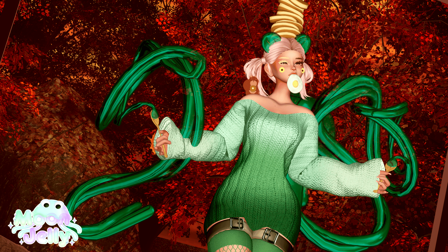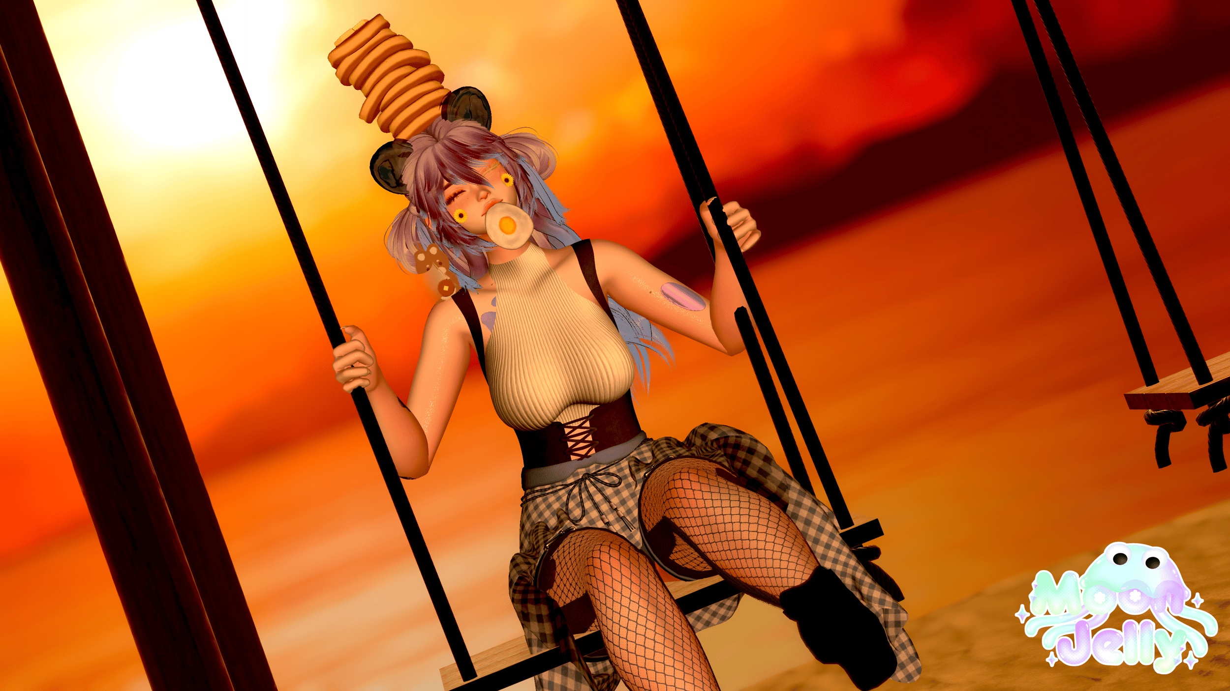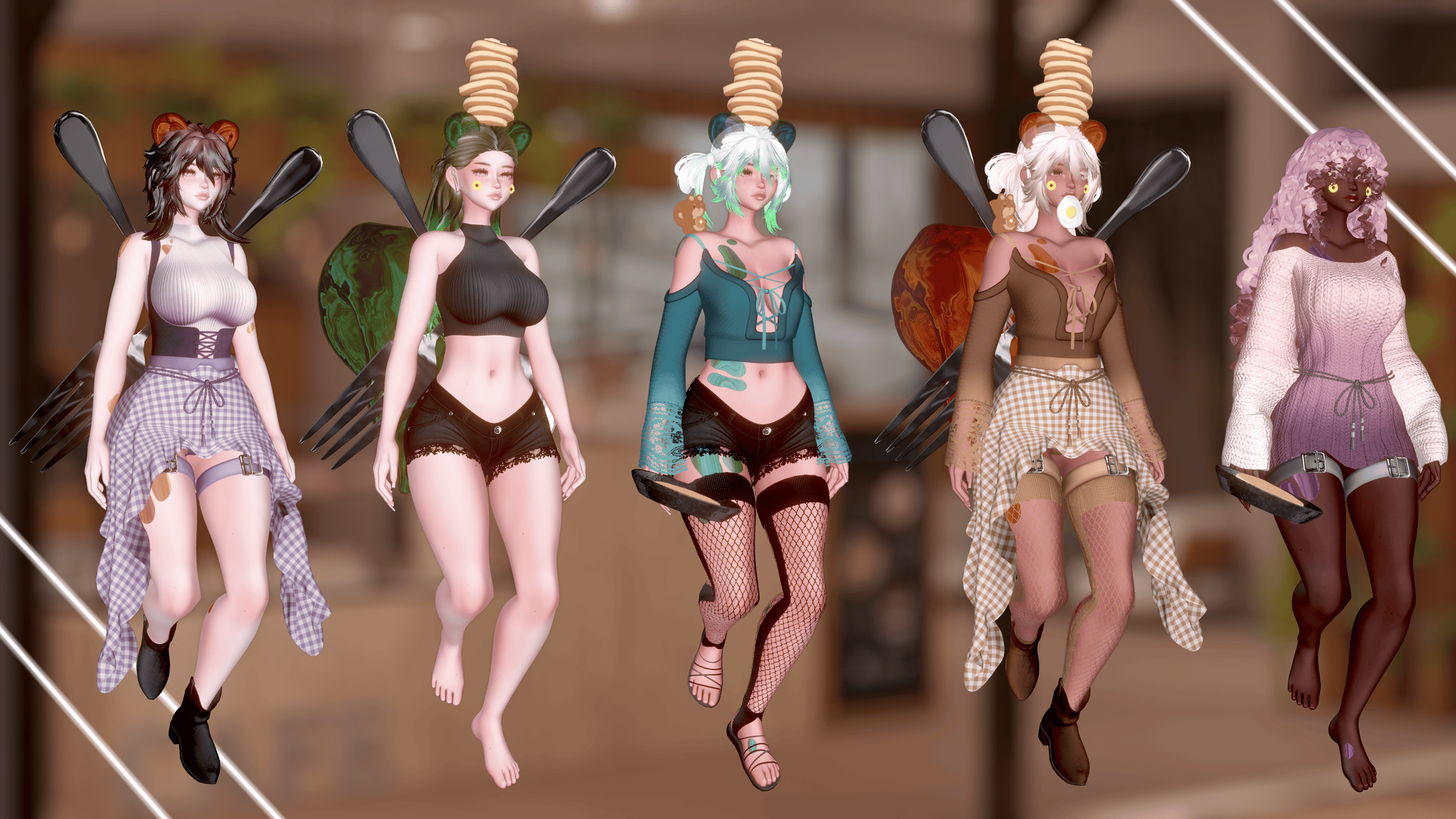 ♡ㅤPancake Flipping Game, Syrup Flow Toys, Giant Fork, Giant Spoon, Skirt, "Bottoms," Garters, Mouth Egg, Cowboy Boots, Sandals, Fishnet Socks, Pancake Hat, Syrup Ears, Syrup Tail, Squirrel Plush, Cheek Flowers, Sweater, Longsleeve, Vest Top, Waist Tie: made by me! (do NOT remove from this avatar to reuse elsewhere.)